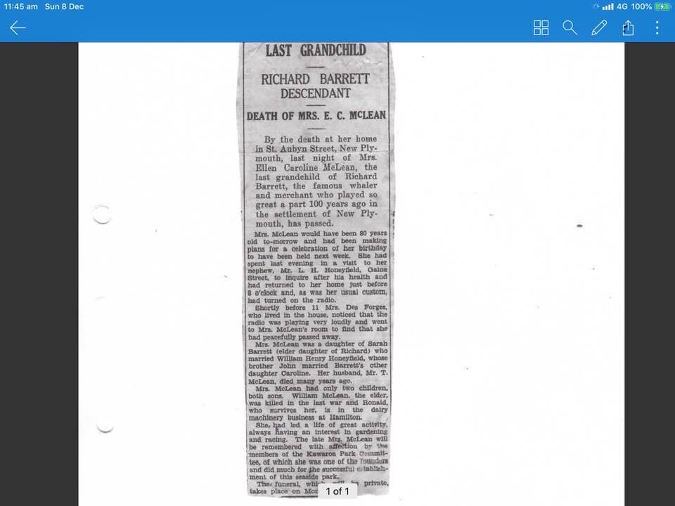 William and Sarah’s first child, Richard Barrett Honeyfield, was born two months after the wedding. He was to be the first grandchild of the late Dicky and Rāwinia Barrett and the first Honeyfield to be born in New Zealand.