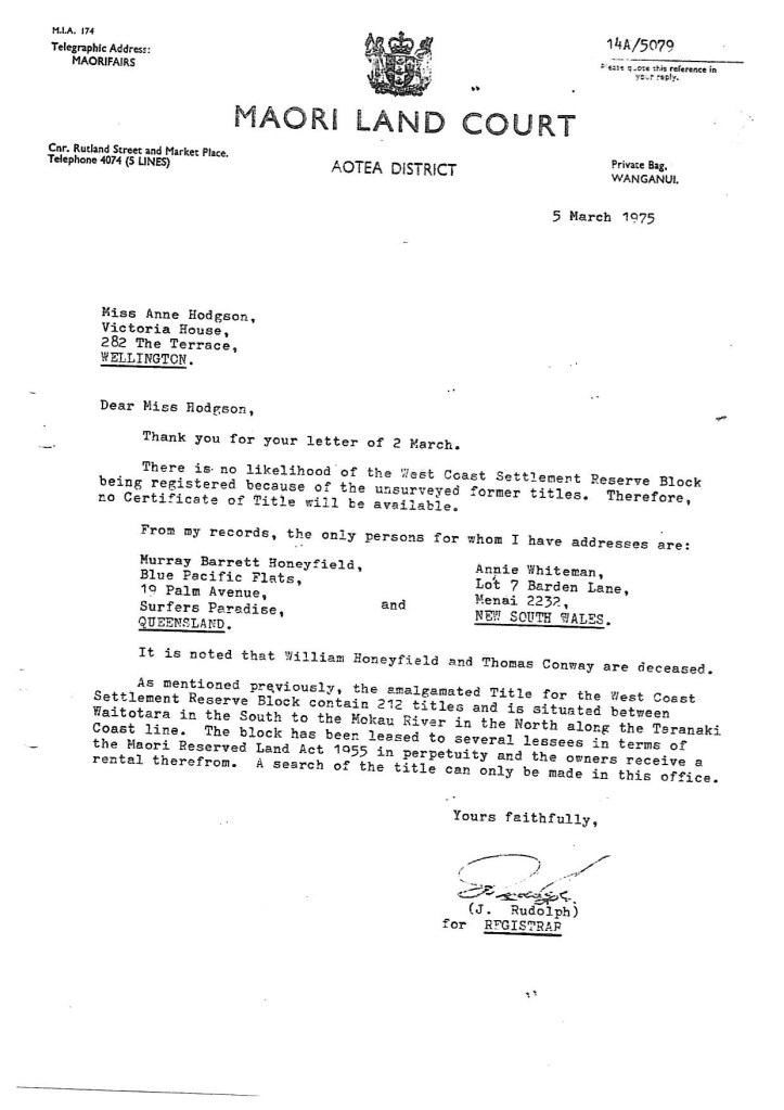 Ronald’s son William sold the interest he inherited from his father to the Maori Trustee in 1970. The land (which had formed part of the West Coast Settlement Reserve Block of Māori land ranging from Waitotara in South Taranaki north through to Mokau) was subsequently vested to Parininihi ki Waitotara (PKW) in 1977, a body formed by a collection of Māori landowners in Taranaki to stop the proliferation of Māori land sales and control the land in the interests of landowners (Source: Ann Hodgson, Maori Land Court – see below).
